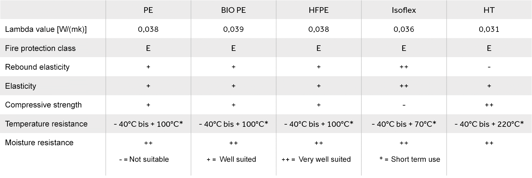 QUALITIESPE-foam: for all common applications – a versatile product that you can rely on. Bio- Isoflex foam: extremely high resilience specifically designed for winding applications. HFPE foam: halogen-free PE foam developed for applications and construction projects that are subject to stringent environmental requirements. HT foam: our HT foam can be inserted into the area between the thermal partitions before the powder coating or anodising because of its high temperature and chemical resistance. Our HT foam can also be inserted into aluminium composites that have already been rolled due to its rigidity.