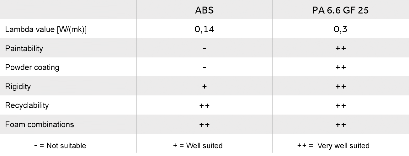 Our thermal breaks made from polyamide (PA) or low conductivity polyamide (LC-PA) with glass fibre reinforcement or from modified ABS are mainly responsible for reducing the heat transfer coefficient (U-value) so that higher insulation values can be achieved in aluminium composite systems.